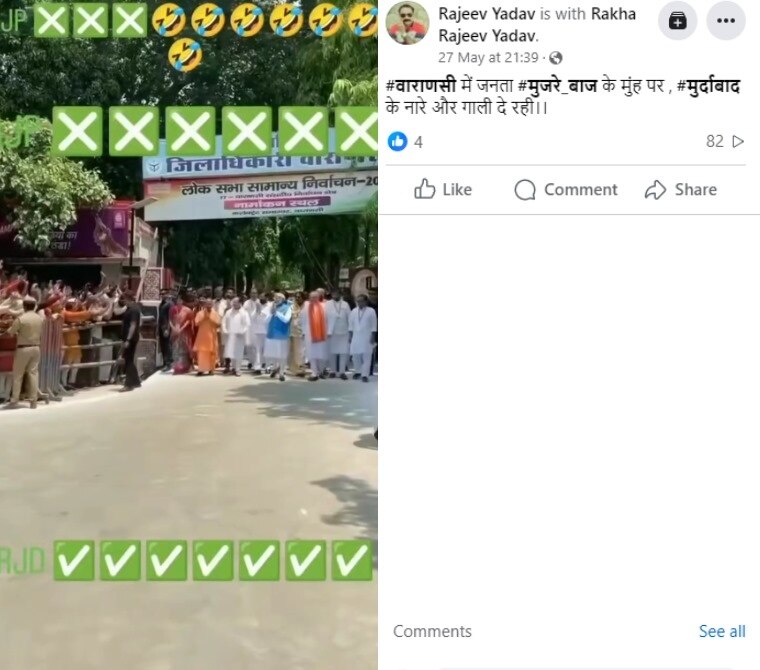 वायरल वीडियो में कुछ लोग कथित तौर पर आपत्तिजनक नारेबाजी करते भी सुनाई देते हैं. इसे शेयर करने वालों की मानें तो जब पीएम मोदी वाराणसी लोकसभा सीट से नामांकन दाखिल कर जिलाधिकारी कार्यालय से बाहर निकल रहे थे, तब लोगों ने उनका 'मुर्दाबाद' के नारों से स्वागत किया. ऐसे ही एक पोस्ट का आर्काइव्ड वर्जन यहां देखा जा सकता है.