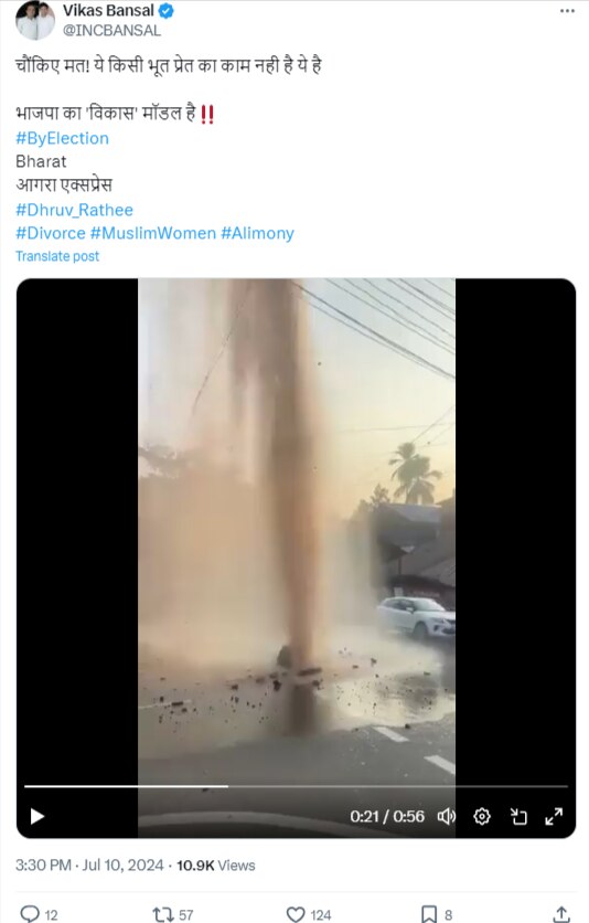 इसे शेयर करते हुए हरियाणा कांग्रेस के नेता विकास बंसल ने लिखा है कि वीडियो यूपी के आगरा एक्सप्रेस वे का है. और भी कई लोगों ने वीडियो को इसी दावे के साथ शेयर किया है. कई यूजर्स ने वीडियो के जरिए सीधे पीएम मोदी पर तंज किया है कि ये “ये मोदी जी का विकास मॉडल हैं या किसी भूत प्रेत का काम?”. वायरल पोस्ट का आर्काइव्ड वर्जन यहां देखा जा सकता है.