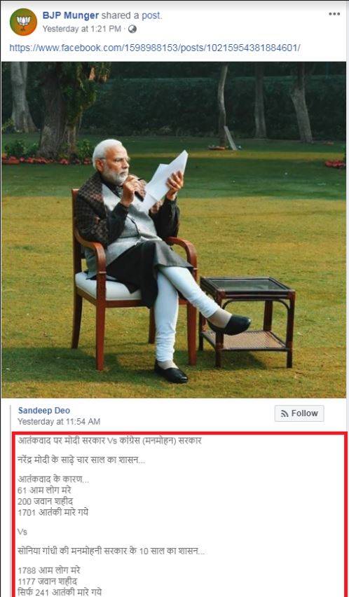 इंडिया टुडे इस निष्कर्ष पर पहुंचा कि जम्मू और कश्मीर में आतंकवाद के परिदृश्य को लेकर प्रधानमंत्री नरेंद्र मोदी और उनके पूर्ववर्ती मनमोहन सिंह के कार्यकालों की तुलना करते हुए अखबार की क्लिप के साथ जो दावा किया गया, वो पूरी तरह गलत है.