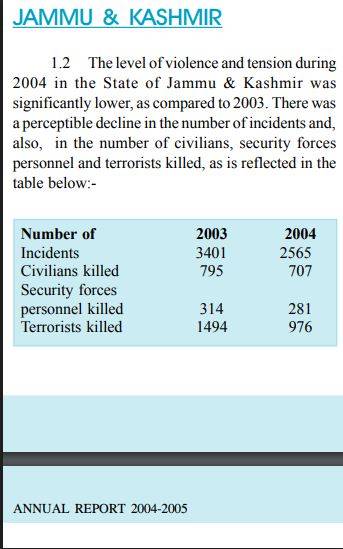 गृह मंत्रालय की वर्ष 2004-05 और 2013-14 की सालाना रिपोर्टों के अनुसार वर्ष 2004 से मार्च 2014 तक कुल 4029 आतंकी मारे गए, 1058 जवान शहीद हुए और 2085 नागरिकों ने अपनी जान गंवाई.