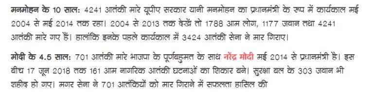 वायरल हो रही अखबार की क्लिपिंग में मौजूद आंकड़े गृह मंत्रालय की रिपोर्ट से भी मेल नहीं खाते. गृह मंत्रालय की ओर से 2017-18 की सालाना रिपोर्ट) में प्रकाशित आंकड़ों के मुताबिक 100 नागरिक और 581 आतंकी मारे गए वहीं 248 जवान शहीद हुए. ऑल्ट न्यूज ने भी इस दावे की पोल खोली है.