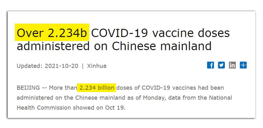 वैश्विक स्तर पर कोविड का लाइव डेटा देने वाली वेबसाइट ‘अवर वर्ल्ड इन डेटा’ के मुताबिक, चीन 20 अक्टूबर 2021 तक लगभग 224 करोड़ वैक्सीन लगा चुका था.