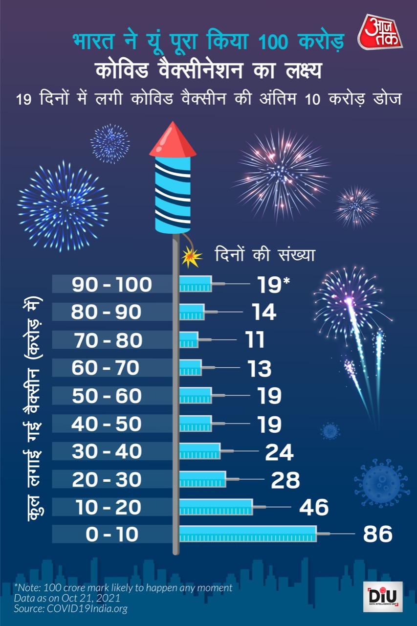 भारत ने 21 अक्टूबर 2021 को 100 करोड़ वैक्सीन का आंकड़ा पार कर लिया. इस मौके पर देश भर में जश्न का माहौल रहा. केंद्रीय स्वास्थ्य मंत्री मनसुख मांडविया ने इसे ‘आत्मनिर्भर भारत की दिवाली’ बताया.