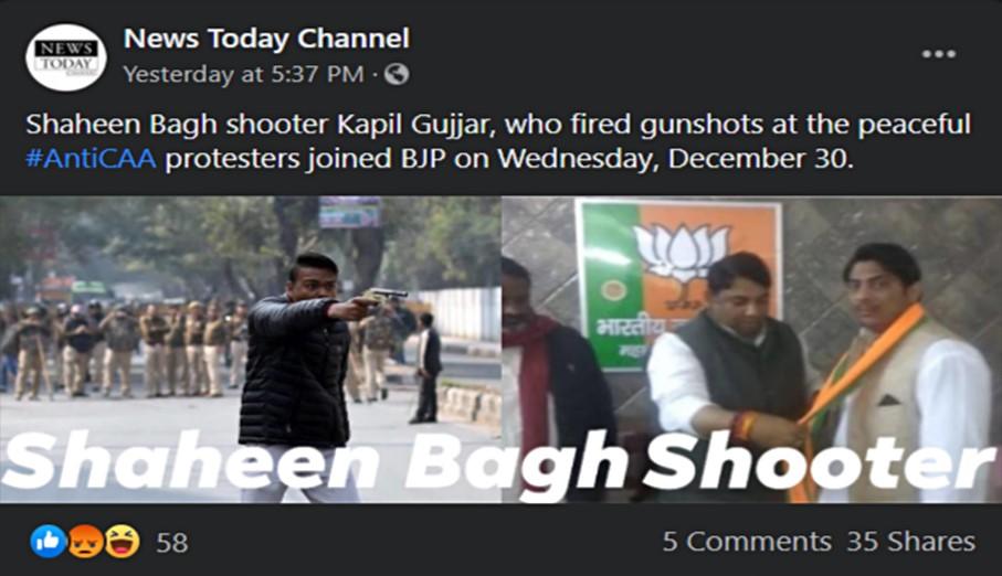 एक फेसबुक यूजर ने ये कोलाज शेयर करते हुए अंग्रेजी में लिखा, जिसका हिंदी अनुवाद है, “शाहीन बाग का शूटर कपिल गुर्जर जिसने नागरिकता कानून के खिलाफ शांतिपूर्ण ढंग से प्रदर्शन कर रहे लोगों पर गोलियां बरसाई थीं, वो 30 दिसंबर को भाजपा में शामिल हो गया.”