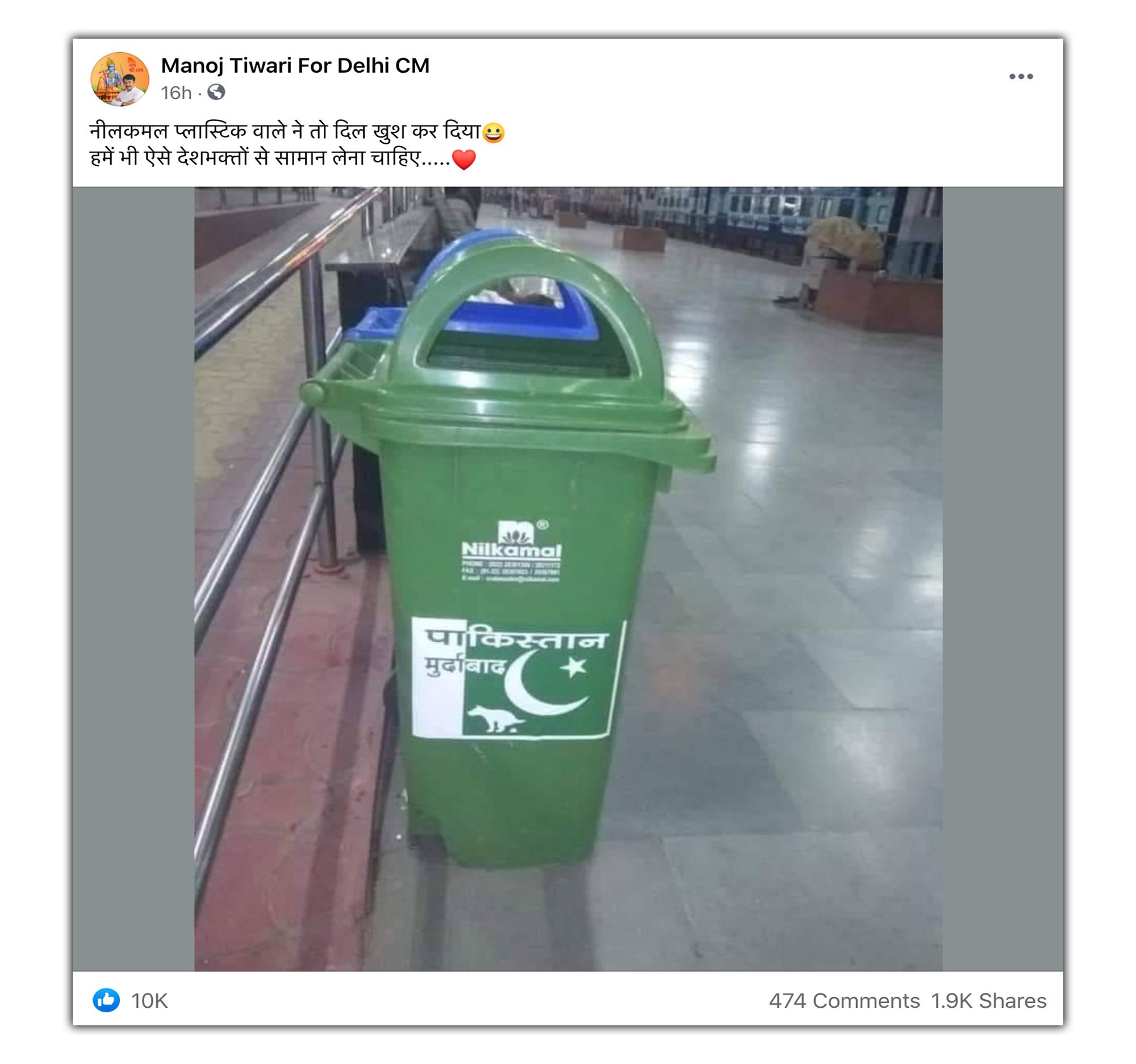 सोशल मीडिया पर एक डस्टबिन की फोटो वायरल हो रही है जिस पर "पाकिस्तान मुर्दाबाद" का पोस्टर चिपका है. डस्टबिन पर प्लास्टिक का सामान बनाने वाली कंपनी 'नीलकमल' का लोगो भी बना हुआ है. सोशल मीडिया यूजर्स दावा कर रहे हैं कि "पाकिस्तान मुर्दाबाद" के पोस्टर वाली ये डस्टबिन 'नीलकमल' ने बनाई है. देखने में ये तस्वीर किसी रेलवे स्टेशन की लगती है जिसके प्लेटफॉर्म पर ये डस्टबिन रखा हुआ है.