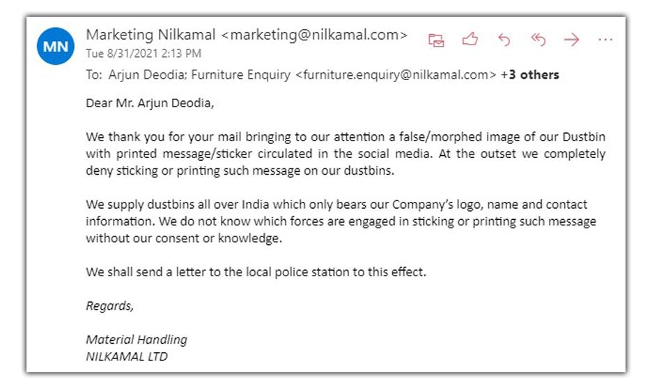 कंपनी का कहना है कि नीलकमल अपने डस्टबिन पर इस तरह के मैसेज ना ही चिपकाता है और ना ही प्रिंट करता है. नीलकमल के डस्टबिन पर कंपनी का लोगो होता है, नाम होता है और संपर्क करने की जानकारी होती है. कंपनी को इस बात कि कोई जानकारी नहीं है कि यह पोस्टर डस्टबिन पर किसने चिपकाए. नीलकमल लिमिटेड इस बात की सूचना लोकल पुलिस को भी देगा. इंटरनेट पर भी हमें नीलकमल के इस तरह के डस्टबिन के बारे में कोई जानकारी नहीं मिली.