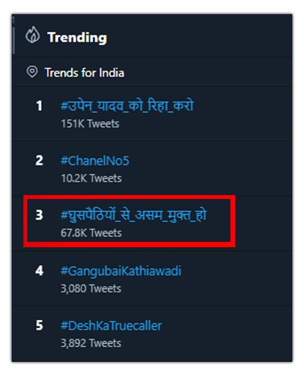 इस फोटो को बहुत सारे लोग ‘#घुसपैठियों_से_असम_मुक्त_हो’ हैशटैग के साथ शेयर कर रहे हैं. खबर लिखे जाने के वक्त ये हैशटैग करीब 70 हजार ट्वीट्स के साथ तीसरे नंबर पर ट्रेंड कर रहा था.