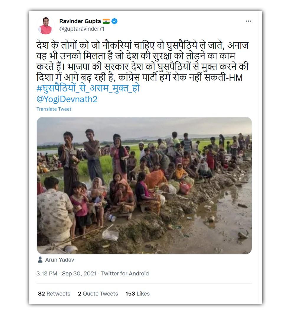 भाजपा नेता और उत्तर दिल्ली नगर निगम के पूर्व मेयर रविंदर गुप्ता ने इस तस्वीर को शेयर करते हुए लिखा, “देश के लोगों को जो नौकरियां चाहिए वो घुसपैठिये ले जाते, अनाज वह भी उनको मिलता है जो देश की सुरक्षा को तोड़ने का काम करते हैं. भाजपा की सरकार देश को घुसपैठियों से मुक्त करने की दिशा में आगे बढ़ रही है, कांग्रेस पार्टी हमें रोक नहीं सकती.”