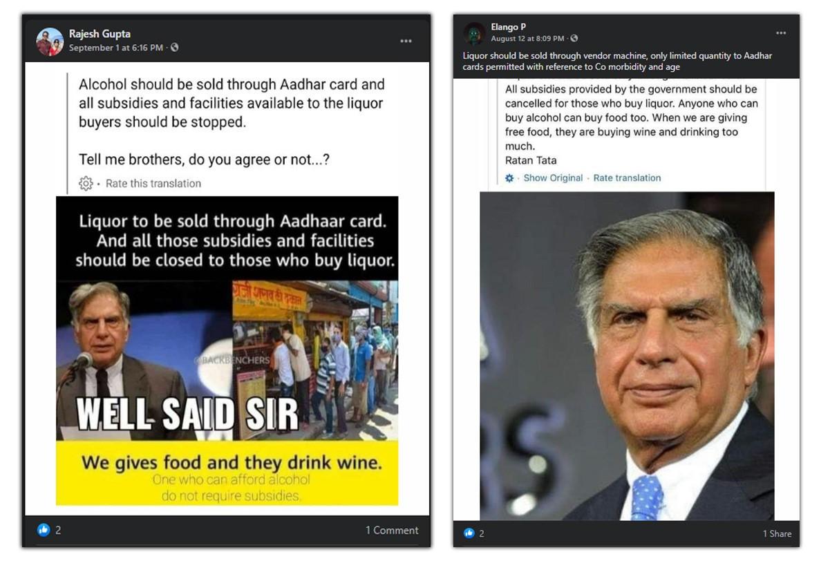 वायरल पोस्ट में पूरा बयान कुछ इस तरह है, “शराब की बिक्री सिर्फ आधार कार्ड के जरिये होनी चाहिए. शराब खरीदने वालों को कोई भी सरकारी सब्सिडी या सुविधाएं नहीं देनी चाहिए. अगर किसी के पास शराब खरीदने के लिए पैसे हैं, तो वो राशन खरीदने में भी सक्षम है. यहां हम लोगों को मुफ्त का राशन दे रहे हैं, वहीं वो शराब में पैसे उड़ा रहे हैं. -रतन टाटा.”