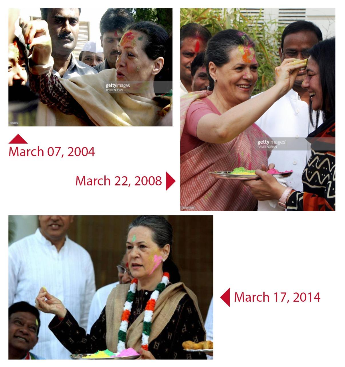 वायरल दावों में कहा जा रहा है कि सोनिया गांधी को मोदी की बढ़ती ताकत की वजह से पहली बार होली मनानी पड़ी. ये दावा इसलिए सही नहीं है क्योंकि हमें सोनिया गांधी की साल 2004 , 2008 और 2014 की कुछ तस्वीरें मिली जिसमें वह रंगो से होली का उत्सव मनाती दिख रही हैं. ये तस्वीरें "गेट्टी इमेजेस" और 'वन इंडिया' की वेबसाइट पर देखी जा सकती हैं.