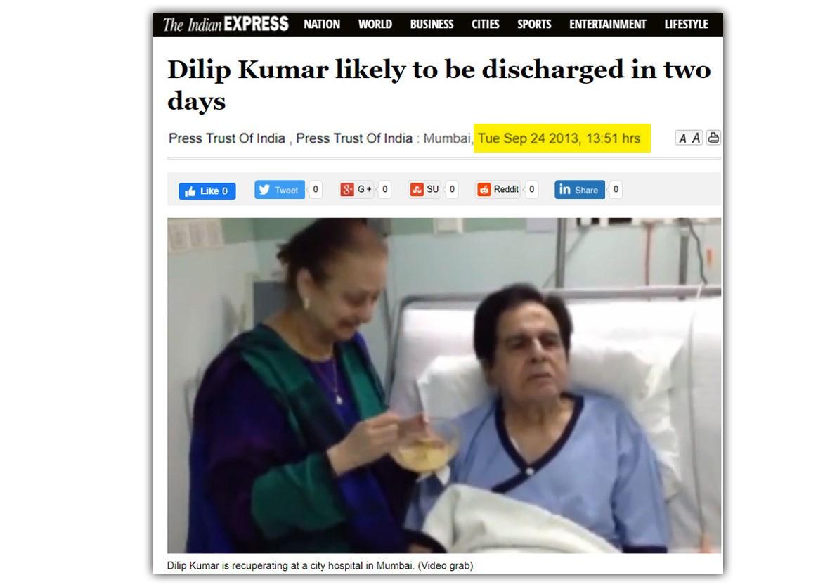 22 सितंबर, 2013 को दिलीप कुमार के आधिकारिक ट्विटर हैंडल से यही वीडियो ट्वीट भी किया था, जिसके साथ कैप्शन में लिखा था, “आपके प्यार और दुआओं के लिए शुक्रिया. अस्पताल में आराम कर रहा हूं.” इस ट्वीट में ये भी कहा गया था कि ये वीडियो एक दिन पहले यानी 21 सितंबर, 2013 का है.