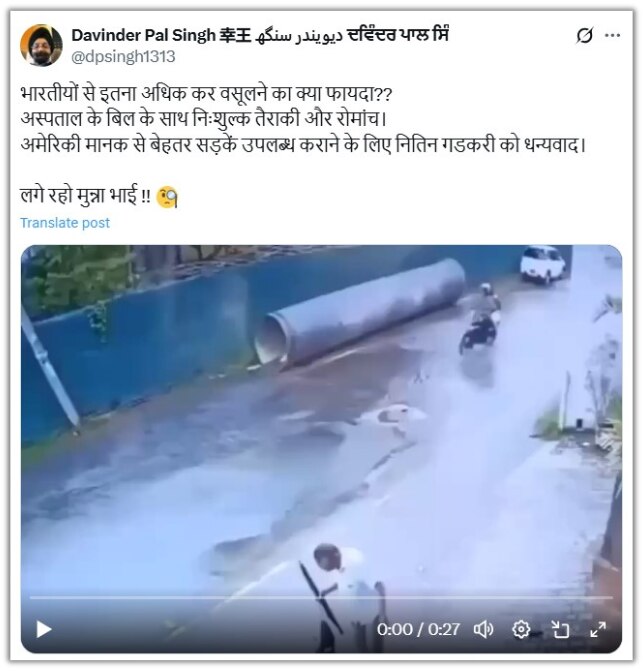 ऐसे ही एक पोस्ट में एक व्यक्ति ने लिखा, “भारतीयों से इतना अधिक कर वसूलने का क्या फायदा? अस्पताल के बिल के साथ निःशुल्क तैराकी और रोमांच. अमेरिकी मानक से बेहतर सड़कें उपलब्ध कराने के लिए नितिन गडकरी को धन्यवाद.” इस पोस्ट का आर्काइव यहां देखा जा सकता है.