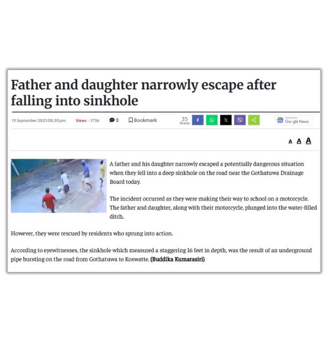 इस जानकारी के साथ सर्च करने पर हमें इसके बारे में छपी कई न्यूज रिपोर्ट्स मिलीं. ‘Daily Mirror Online’ की 19 सितंबर, 2023 की रिपोर्ट के मुताबिक ये घटना श्री लंका के कोलंबो की है. खबर में बताया गया है कि गोथातुवा इलाके में एक आदमी अपनी बेटी को स्कूल छोड़ने के लिए बाइक से जा रहा था. इस दौरान वो बीच सड़क पर पानी से भरे एक गड्ढे में बाइक समेत गिर पड़े. बाद में वहां मौजूद लोगों ने उन दोनों को गड्ढे से सुरक्षित बाहर निकाल लिया.