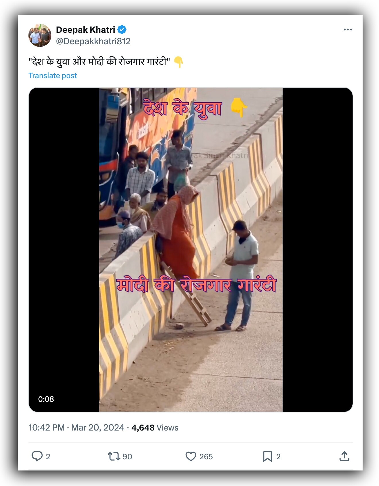 मिसाल के तौर पर, कांग्रेस के सोशल मीडिया एंड डिजिटल प्लेटफॉर्म्स के नेशनल को-ऑर्डिनेटर दीपक खत्री ने मोदी सरकार पर तंज कसते हुए इस वीडियो के साथ लिखा, "देश के युवा और मोदी की रोजगार गारंटी.”