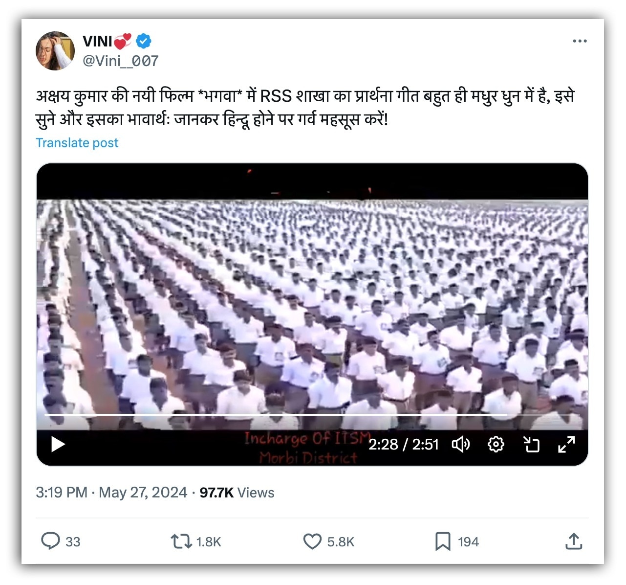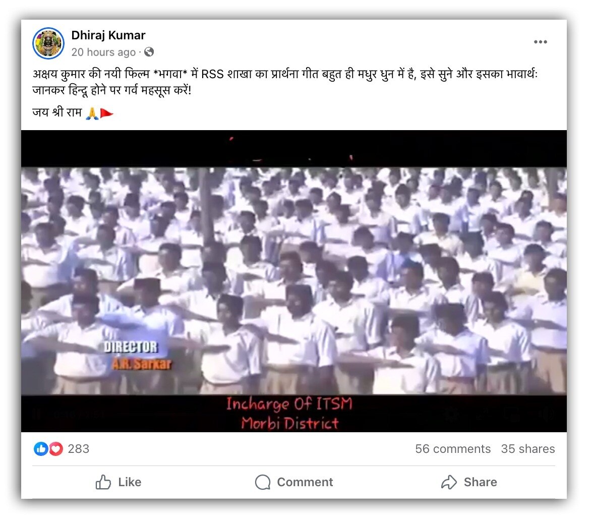 वीडियो के साथ कहा जा रहा है कि ये अक्षय कुमार की नई फिल्म ‘भगवा’ का गाना है. वीडियो के साथ कैप्शन में लिखा है, “अक्षय कुमार की नयी फिल्म *भगवा* में RSS शाखा का प्रार्थना गीत बहुत ही मधुर धुन में है, इसे सुने और इसका भावार्थः जानकर हिन्दू होने पर गर्व महसूस करें!”