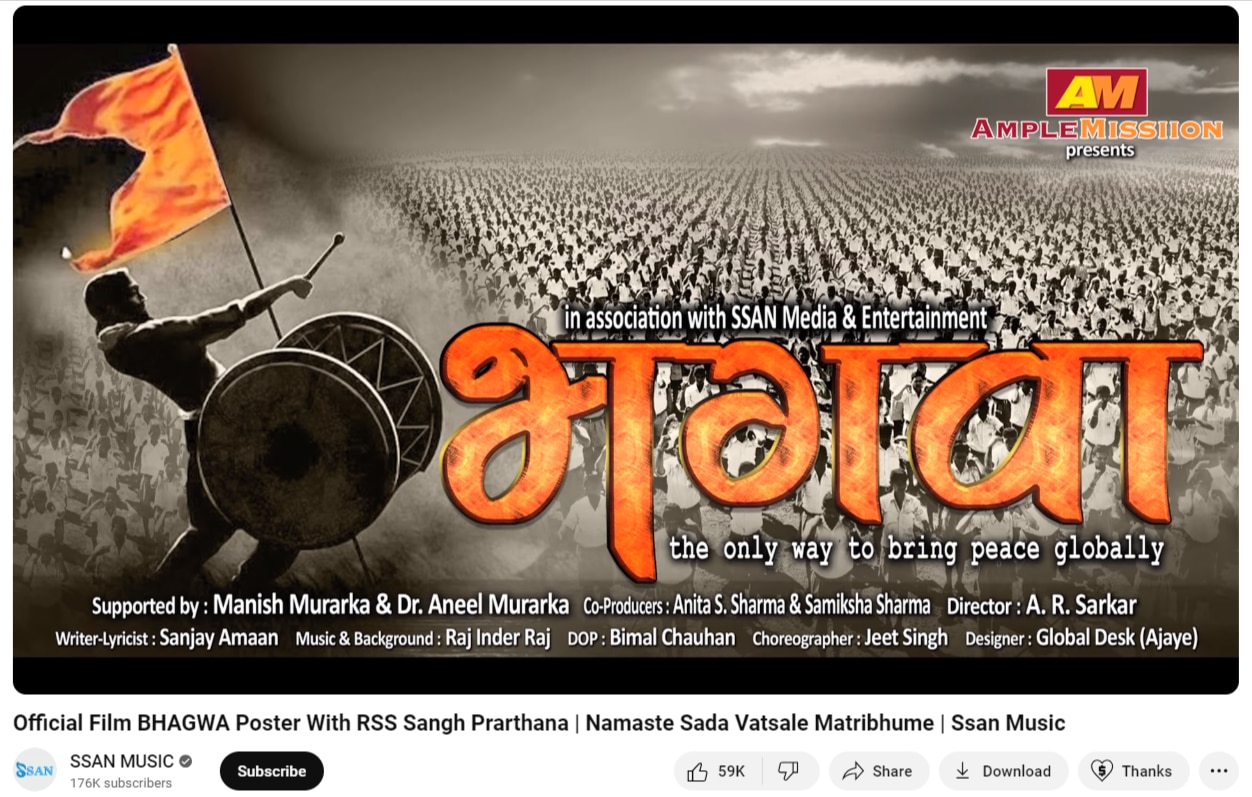 कीवर्ड सर्च की मदद से हमें इस वीडियो का लंबा वर्जन “SSAN Music” नाम के एक वेरिफाइड यूट्यूब चैनल पर मिला. यहां इसे 18 अक्टूबर, 2017 को अपलोड किया गया था. वीडियो के टाइटल में लिखा है कि ये ‘भगवा’ फिल्म का संघ की प्रार्थना पर आधारित गाना है.
