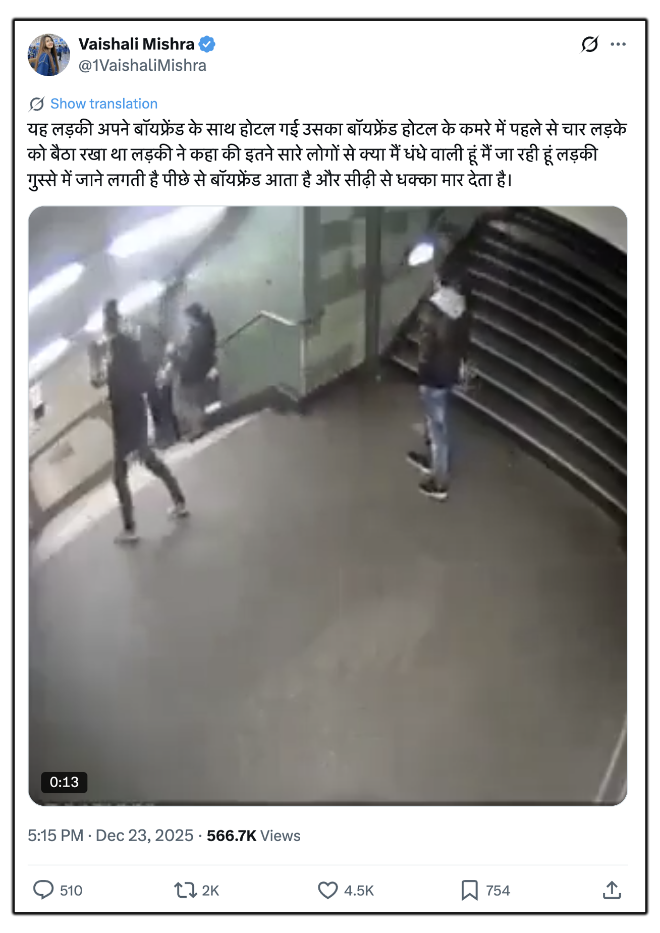 एक एक्स यूजर ने इस वीडियो को पोस्ट करते हुए लिखा, "यह लड़की अपने बॉयफ्रेंड के साथ होटल गई उसका बॉयफ्रेंड होटल के कमरे में पहले से चार लड़के को बैठा रखा था लड़की ने कहा की इतने सारे लोगों से क्या मैं ** वाली हूं मैं जा रही हूं लड़की गुस्से में जाने लगती है पीछे से बॉयफ्रेंड आता है और सीढ़ी से धक्का मार देता है."