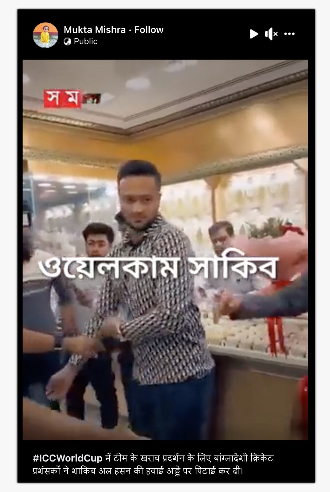 वीडियो को शेयर कर एक फेसबुक यूजर ने लिखा, 'आईसीसी विश्व कप टूर्नामेंट में टीम के खराब प्रदर्शन के लिए बांग्लादेशी क्रिकेट प्रशंसकों ने शाकिब अल हसन की हवाई अड्डे पर पिटाई कर दी. इसे देखने के बाद एंजेलो मैथ्यूज सबसे ज्यादा खुश हुए होंगे.' ऐसे ही कुछ पोस्ट्स का आर्काइव्ड वर्जन यहां और यहां देखा जा सकता है.