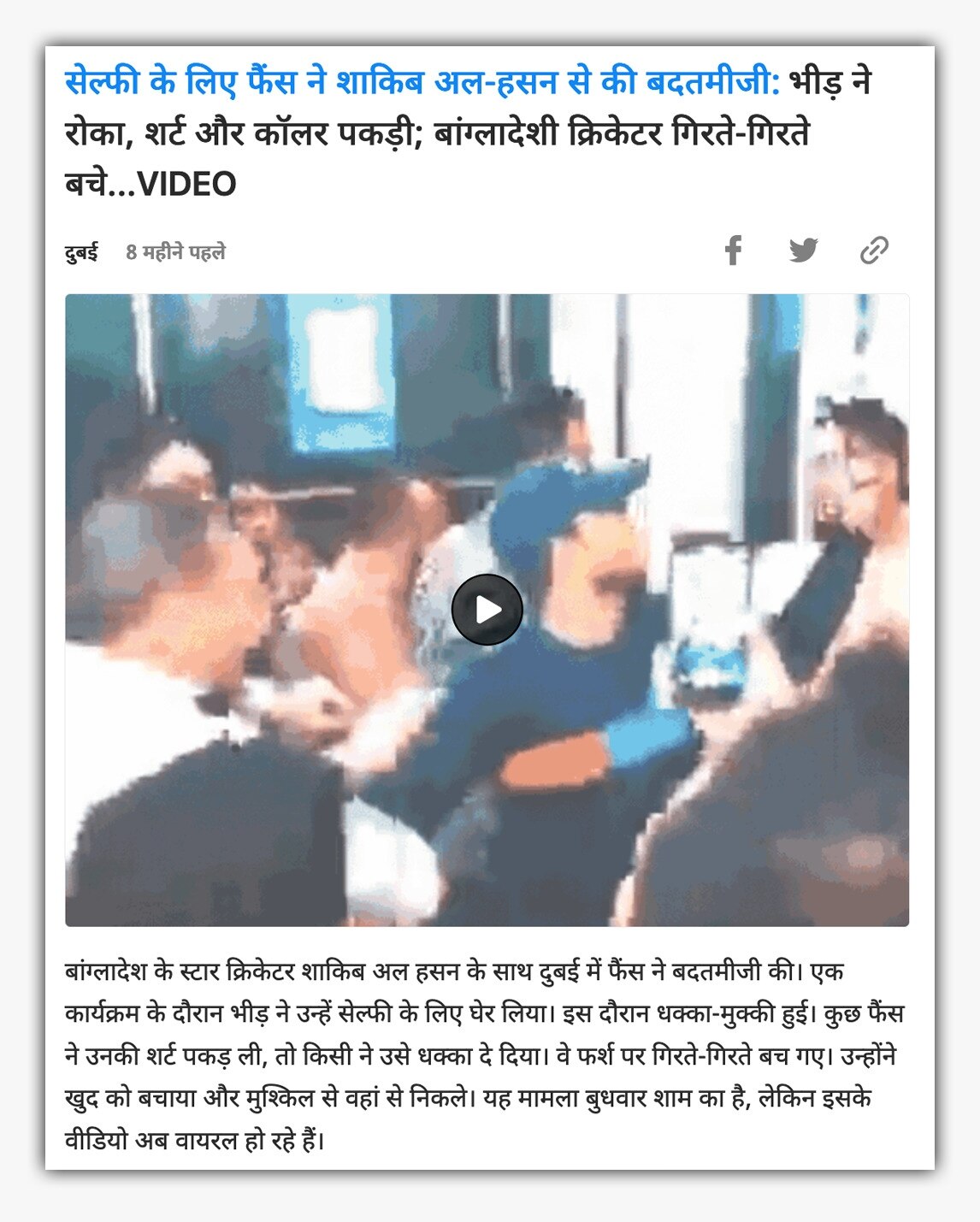 हमने वायरल वीडियो को जब कीफ्रेम्स की मदद से रिवर्स सर्च किया तो हमें ऐसी कई न्यूज रिपोर्ट्स मिलीं जिसमें शाकिब का ये वीडियो भी मौजूद था. खबरों के मुताबिक, ये वीडियो मार्च 2023 का है, जब शाकिब एक ज्वेलरी के शोरूम का उद्घाटन करने के लिए दुबई गए थे. उस दौरान प्रशंसकों द्वारा उनके साथ दुर्व्यवहार किया गया. कुछ ने उन्हें धक्का दिया, तो कुछ ने उनकी टीशर्ट का कॉलर तक पकड़ लिया.