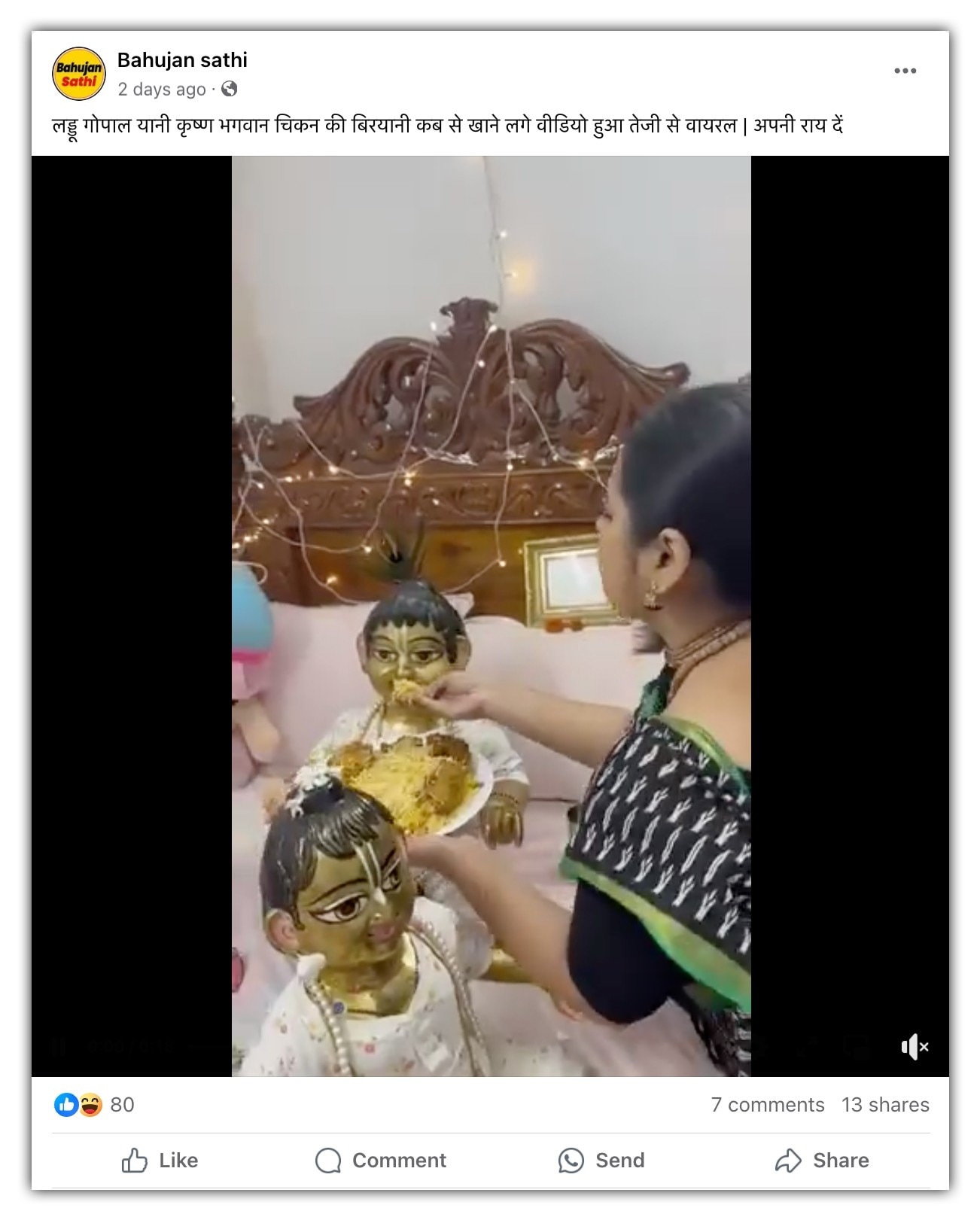 एक फेसबुक यूजर ने इसे शेयर करते हुए लिखा, “लड्डू गोपाल यानी कृष्ण भगवान चिकन की बिरयानी कब से खाने लगे वीडियो हुआ तेजी से वायरल.”