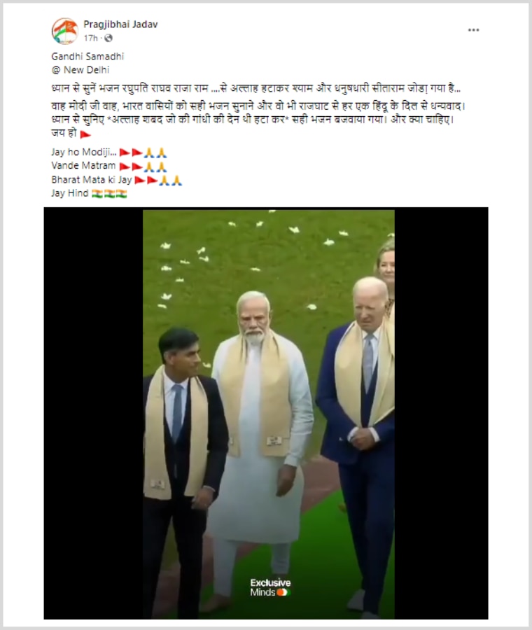 अब इसे शेयर करते हुए सोशल मीडिया पर कुछ लोग ऐसा कह रहे हैं कि ये वीडियो जी20 सम्मेलन का है, जिसमें दुनियाभर के नेता महात्मा गांधी को श्रद्धांजलि देने राजघाट पहुंचे थे. हालांकि, लोगों की मानें तो इस अवसर पर राजघाट पर चलाए गए ‘रघुपति राघव राजा राम’ गीत के साथ छेड़छाड़ की गई थी. गीत में कथित रूप से ‘अल्लाह’ शब्द हटा कर ‘श्याम’ और ‘धनुषधारी सीताराम’ जोड़ दिया गया था.