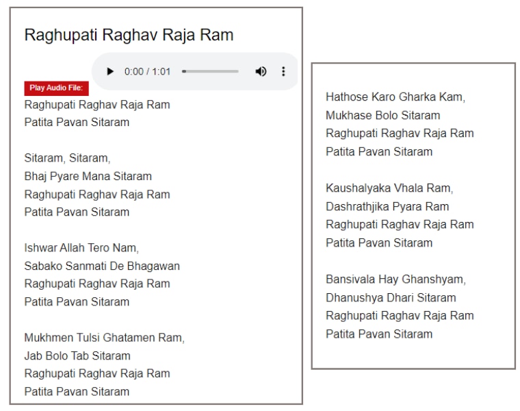 ‘गांधी सेवाग्राम आश्रम’ की वेबसाइट पर महात्मा गांधी वाले ‘रघुपति राघव राजा राम’ गीत के बोल दिए गए हैं. ध्यान देने वाली बात ये है कि ‘बंसीवाला हे घनश्याम, धनुष्य धारी सीताराम’ वाली लाइन भी इस गीत का हिस्सा है.