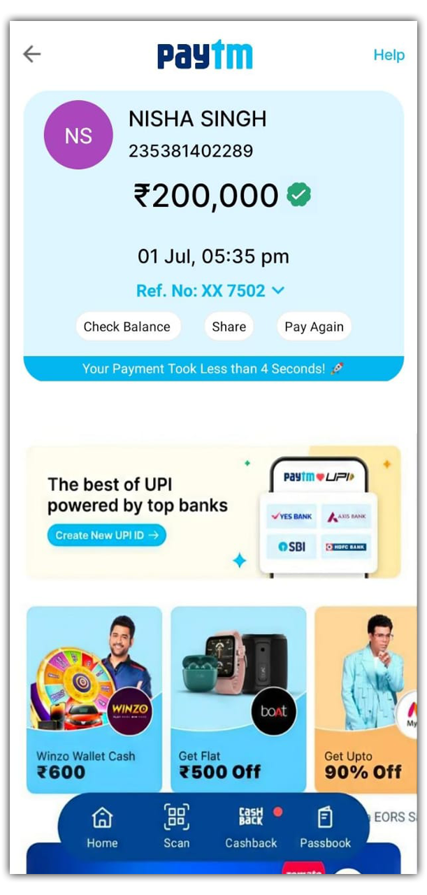उसने पेटीएम का एक स्क्रीनशॉट भी भेजा जिसमें हमारे फर्जी आधार कार्ड वाला नाम 'निशा सिंह' और नकली अकाउंट नंबर दिख रहा है. इसमें भेजी गई राशि दो लाख रुपये लिखी है. जाहिर है, ये पूरी तरह फर्जी है.