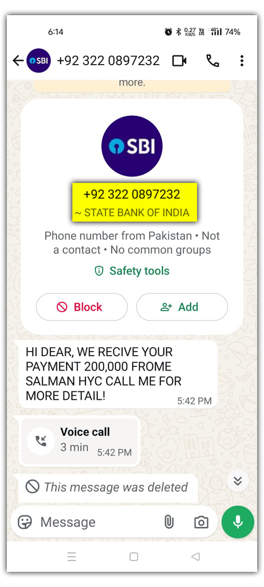 थोड़ी देर बाद हमारे पास पाकिस्तान के एक और नंबर से कॉल आया जिस पर स्टेट बैंक ऑफ इंडिया की डीपी लगी है.