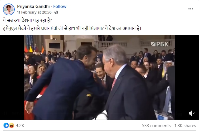 वीडियो देख कर ऐसा लगता है कि मैक्रों, अमेरिका के उपराष्ट्रपति जेडी वेंस से हाथ मिलाते हैं और कुछ अन्य नेताओं का अभिवादन करते हैं, लेकिन इसी दौरान वो पहली कतार में बैठे पीएम मोदी से हाथ नहीं मिलाते और आगे बढ़ जाते हैं.