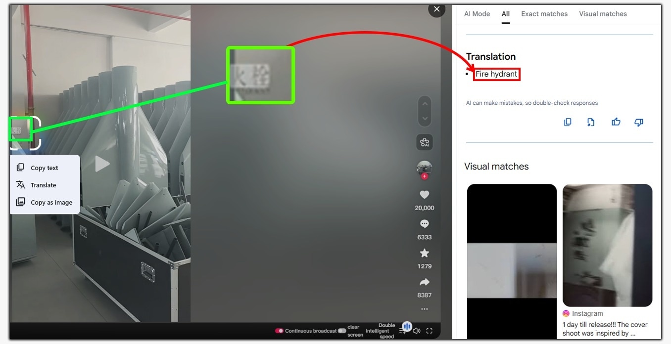 वीडियो में कुछ उपकरणों पर चीनी भाषा में कुछ लिखा हुआ दिखता है जिसका अनुवाद है, फायर हाइड्रेंट, इसका मतलब है, आग बुझाने वाला यंत्र.