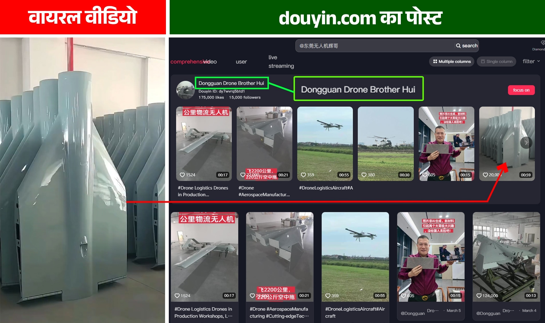 जहां वायरल वीडियो के बैकग्राउंड में म्यूजिक बज रहा था, वहीं इस वीडियो में चीनी भाषा में एक महिला का वॉइसओवर है. साफ पता लग रहा है कि वॉइसओवर हटाकर जानबूझकर म्यूजिक लगा दिया है ताकि लोग इसकी असलियत न जान पाएं. अकाउंट के बायो सेक्शन में दी गई जानकारी  के मुताबिक, ये चीन के Guangdong सूबे में रहने वाले 40 वर्षीय ड्रोन एक्सपर्ट Hui का अकाउंट है.