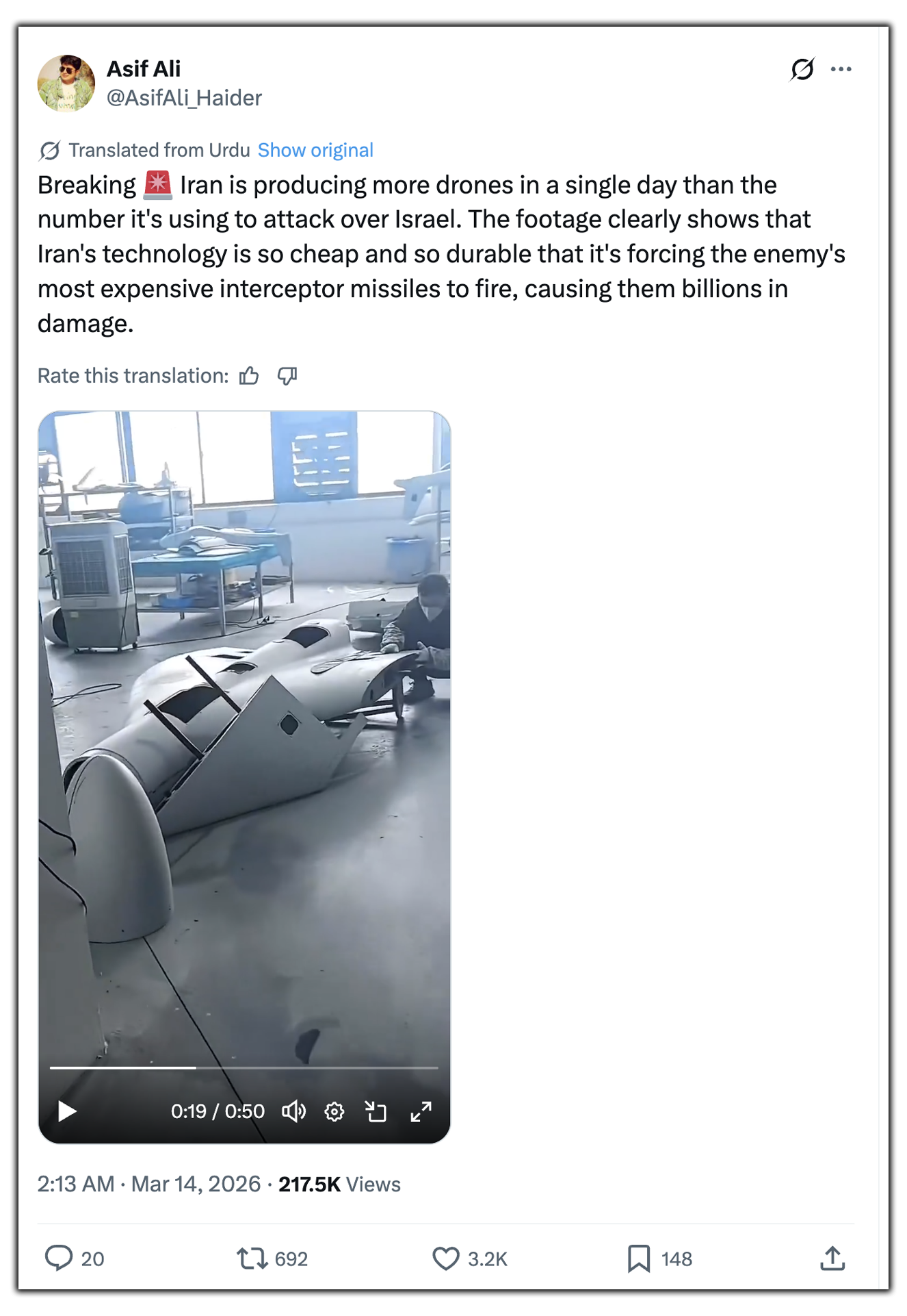एक एक्स यूजर ने) इस वीडियो को पोस्ट करते हुए लिखा, 'ईरान एक दिन में जितने ड्रोन्स से इजरायल पर हमला कर रहा है, उससे कहीं ज्यादा का वो दिन भर में बना ले रहा है. इस वीडियो को देखकर समझा जा सकता है कि आखिर किस तरह ईरान की सस्ती और टिकाऊ तकनीक से दुश्मन का अरबों का नुकसान हो रहा है.'