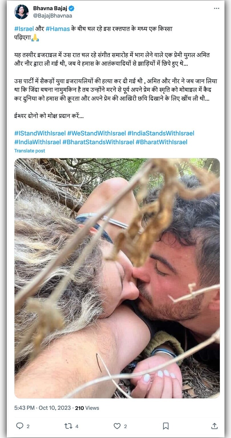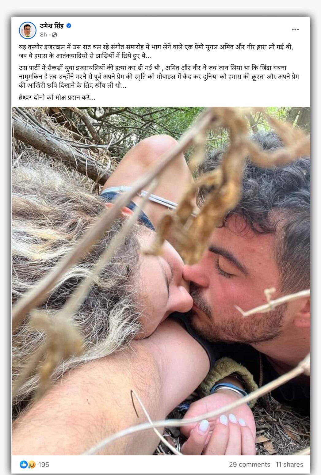 वायरल पोस्ट के अनुसार, फोटो अमित और नीर नाम के एक प्रेमी जोड़े की है, जो इजराइल में हमले की रात चल रहे संगीत समारोह में शामिल थे. लेकिन समारोह में आतंकियों ने हमला कर दिया और दोनों बचने के लिए झाड़ियों में छिप गए. जब दोनों को ये लगने लगा कि अब बच पाना नामुमकिन है तो उन्होंने अपने आखिरी पलों को मोबाइल में कैद कर लिया, जिससे दुनिया को हमास की क्रूरता दिखाई जा सके. पोस्ट के आखिर में लिखा है, “ईश्वर दोनों को मोक्ष प्रदान करें.”