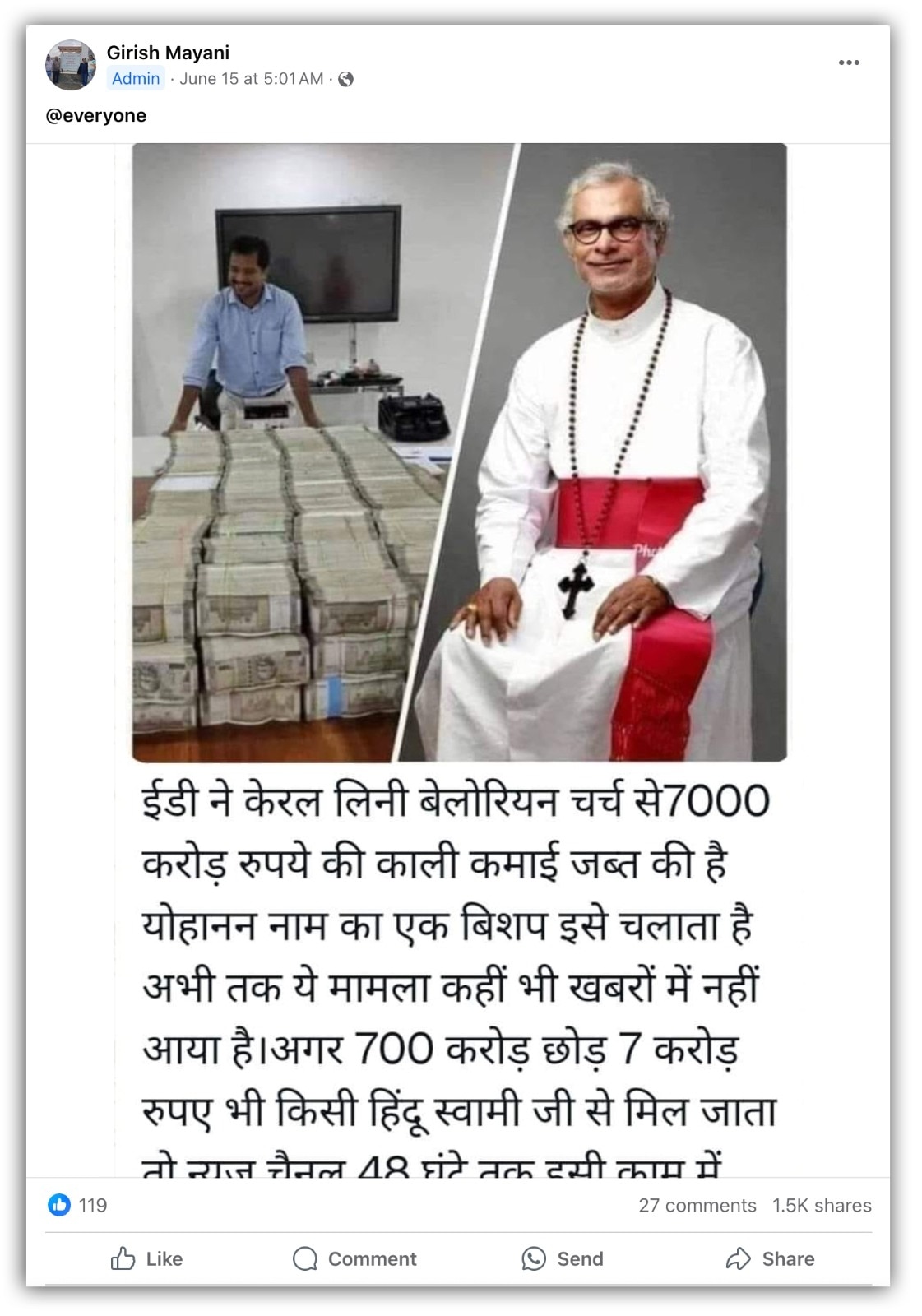 ऐसे ही एक फेसबुक पोस्ट में लिखा है, “ईडी ने केरल लिनी बेलोरियन चर्च से 7000 करोड़ रुपये की काली कमाई जब्त की है. योहानन नाम का एक बिशप इसे चलाता है. अभी तक ये मामला कहीं भी खबरों में नहीं आया है. अगर 700 करोड़ छोड़ 7 करोड़ रुपए भी किसी हिंदू स्वामी जी से मिल जाता तो न्यूज़ चैनल 48 घंटे तक इसी काम में नंगा हो नाचने लगते.” इसका आर्काइव्ड वर्जन यहां देखा जा सकता है.