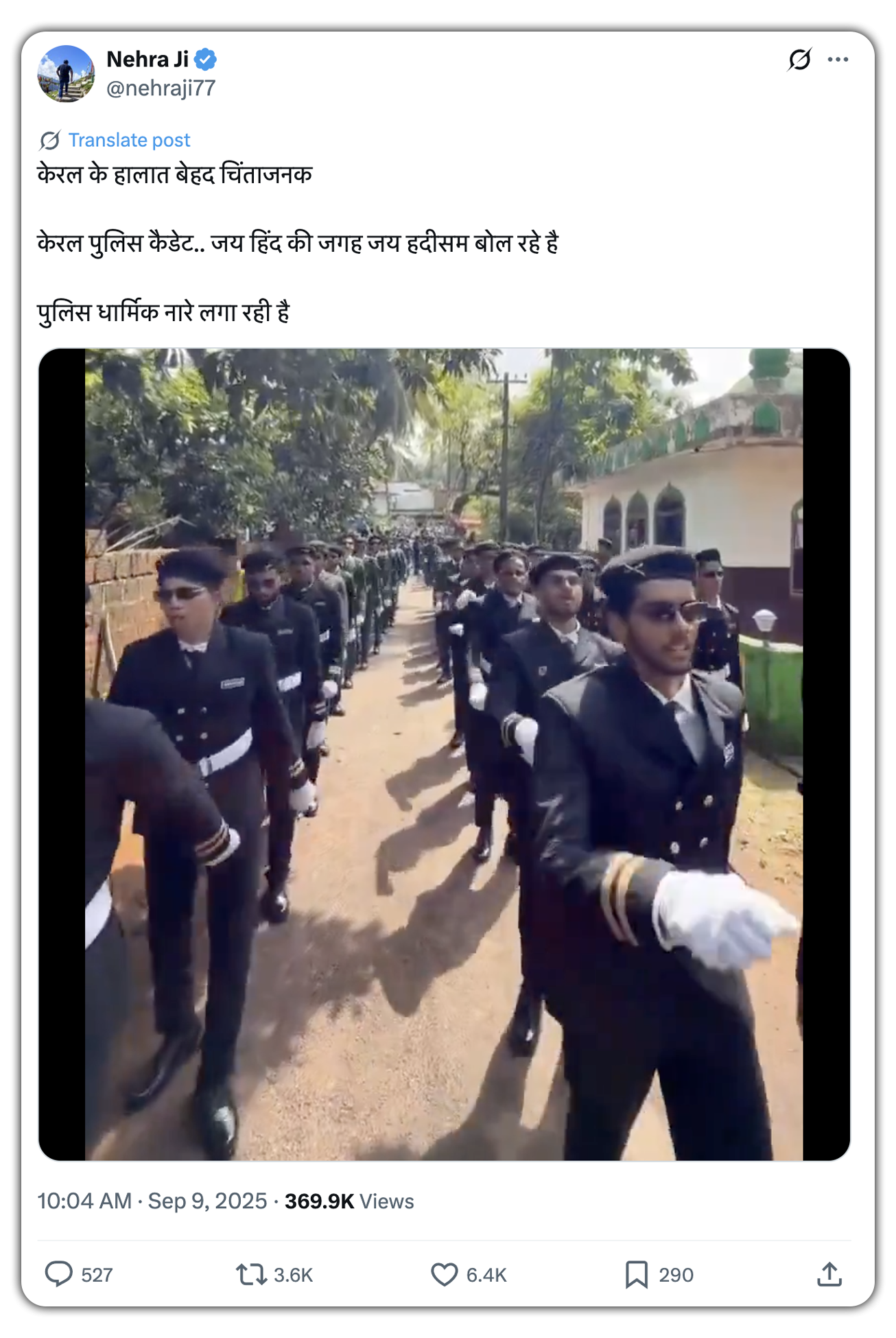 एक एक्स यूजर ने इस वीडियो को पोस्ट करते हुए लिखा, "केरल के हालात बेहद चिंताजनक केरल पुलिस कैडेट. जय हिंद की जगह जय हदीसम बोल रहे है. पुलिस धार्मिक नारे लगा रही है."