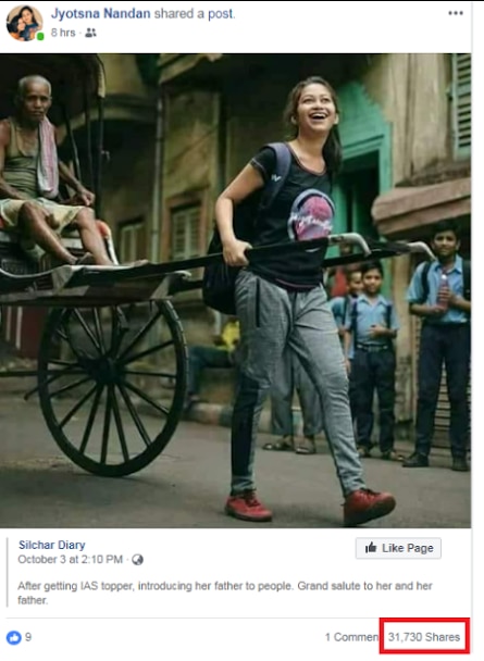 सोशल मीडिया पर एक तस्वीर बहुत शेयर की जा रही है. इसमें एक लड़की को हाथ वाला रिक्शा खींचते देखा जा सकता है. रिक्शे की सीट पर एक बुजुर्ग शख्स बैठा है. तस्वीर के साथ मैसेज ऐसा है कि जो भी पढ़े उसके दिल को छू जाए. मैसेज में लिखा है- "एक IAS टॉपर लड़की अपने पिता को दुनिया से रूबरू करवाती हुई. लड़की और उसके पिता को सलाम."