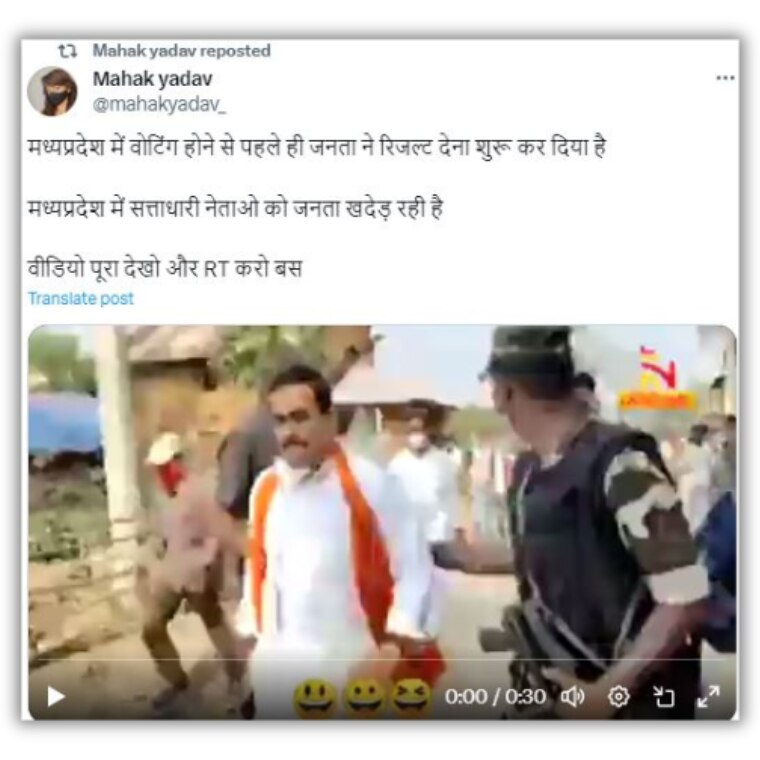 इस वीडियो को समाजवादी पार्टी के नेता आईपी सिंह ने भी अपने ट्विटर हैंडल से शेयर किया. इसके साथ उन्होंने लिखा, “मध्यप्रदेश में जनता भाजपा नेताओं को क्षेत्र में दौड़ा-दौड़ा कर मार पीट रही है उनके सुरक्षा कर्मी अपनी जान पर खेलकर भाजपा नेता को लेकर भागे लोग गाड़ियों पर पत्थर और लाठियों से हमला कर रहे थे. भाजपा तो गयी देश से.” इस पोस्ट का आर्काइव्ड वर्जन यहां देखा जा सकता है.