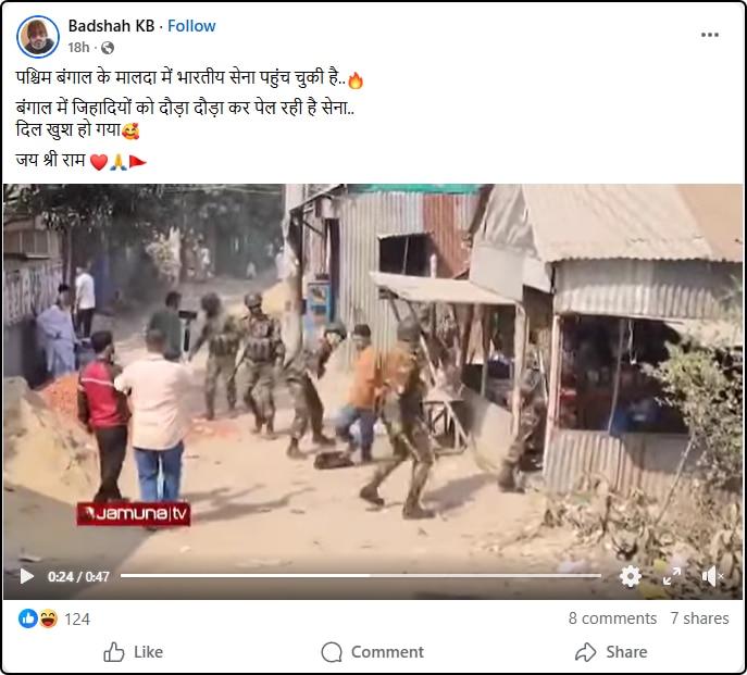 इस बीच सोशल मीडिया पर एक वीडियो खूब वायरल हो रहा है. वीडियो में सेना के जवान कुछ लोगों को लाठियों से मारते हुए नजर आ रहे हैं. अब इस वीडियो को शेयर करते हुए कुछ लोग कह रहे हैं कि भारतीय सेना मालदा में पहुंच चुकी है और उपद्रवियों को सबक सिखा रही है.