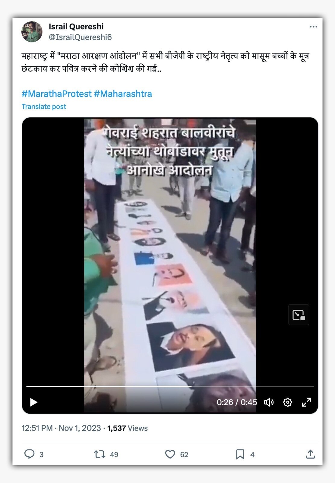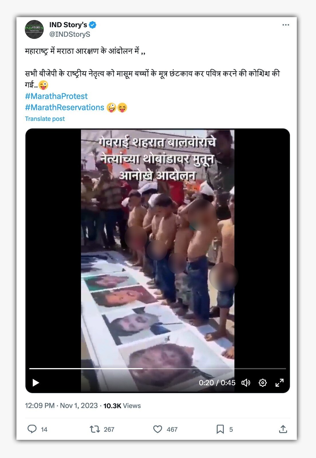 ट्विटर पर इसे शेयर करते हुए लोग कैप्शन में लिख रहे हैं, "महाराष्ट्र में "मराठा आरक्षण आंदोलन" में सभी बीजेपी के राष्ट्रीय नेतृत्व को मासूम बच्चों के मूत्र छंटकाव कर पवित्र करने की कोशिश की गई". फेसबुक पर भी यूजर्स ने इसे शेयर किया है.