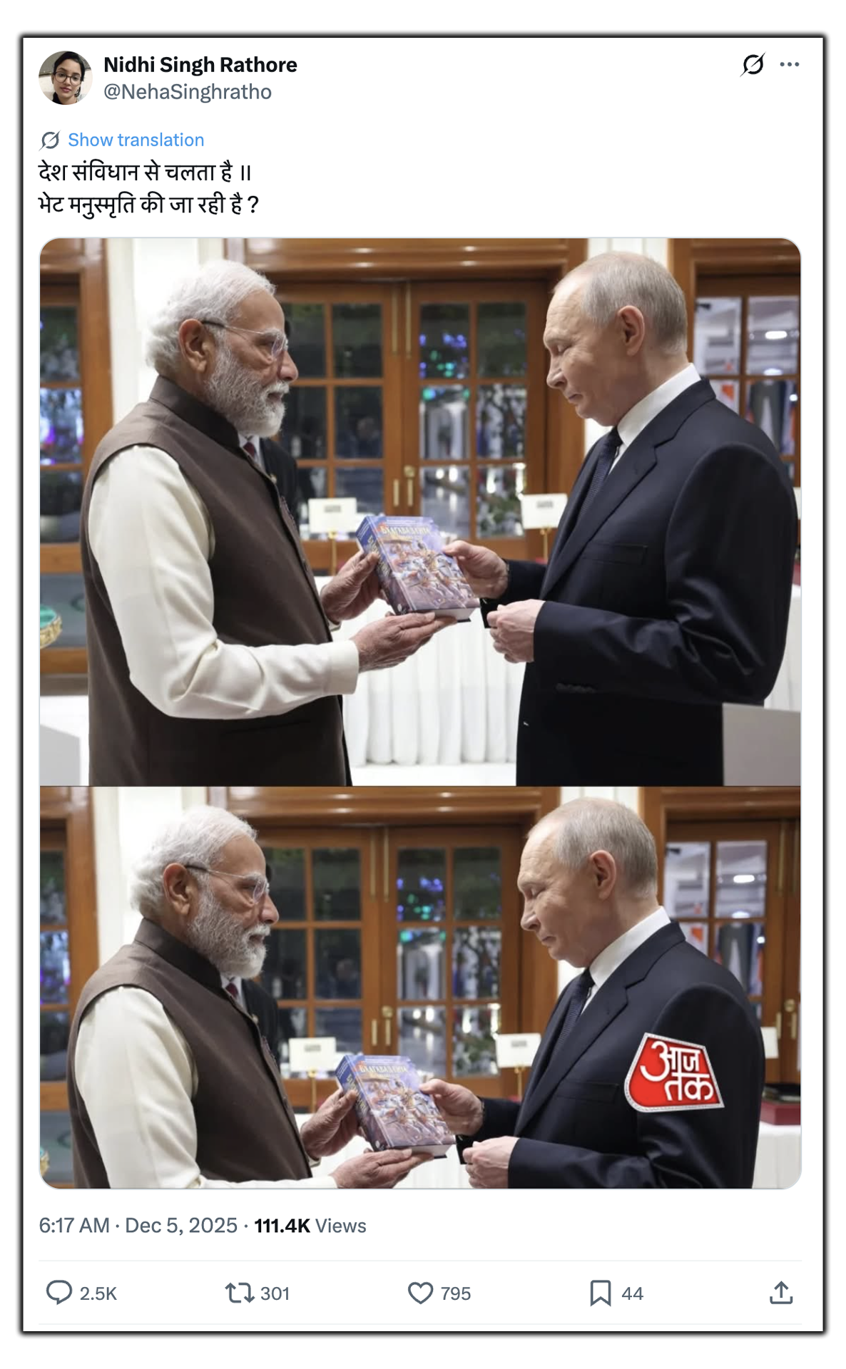 आजतक फैक्ट चेक ने पाया कि पीएम मोदी ने रूसी राष्ट्रपति पुतिन को गीता का रूसी संस्करण भेंट किया था, न कि मनुस्मृति.