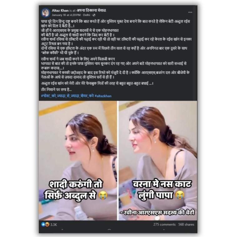 RSS प्रमुख मोहन भागवत के नाम पर वायरल एक सनसनीखेज सोशल मीडिया पोस्ट में कहा जा रहा है कि रूस में डॉक्टरी की पढ़ाई कर रही उनकी बेटी रवीना शर्मा का रईस खान नाम के एक मुस्लिम युवक के साथ प्रेम संबंध है.