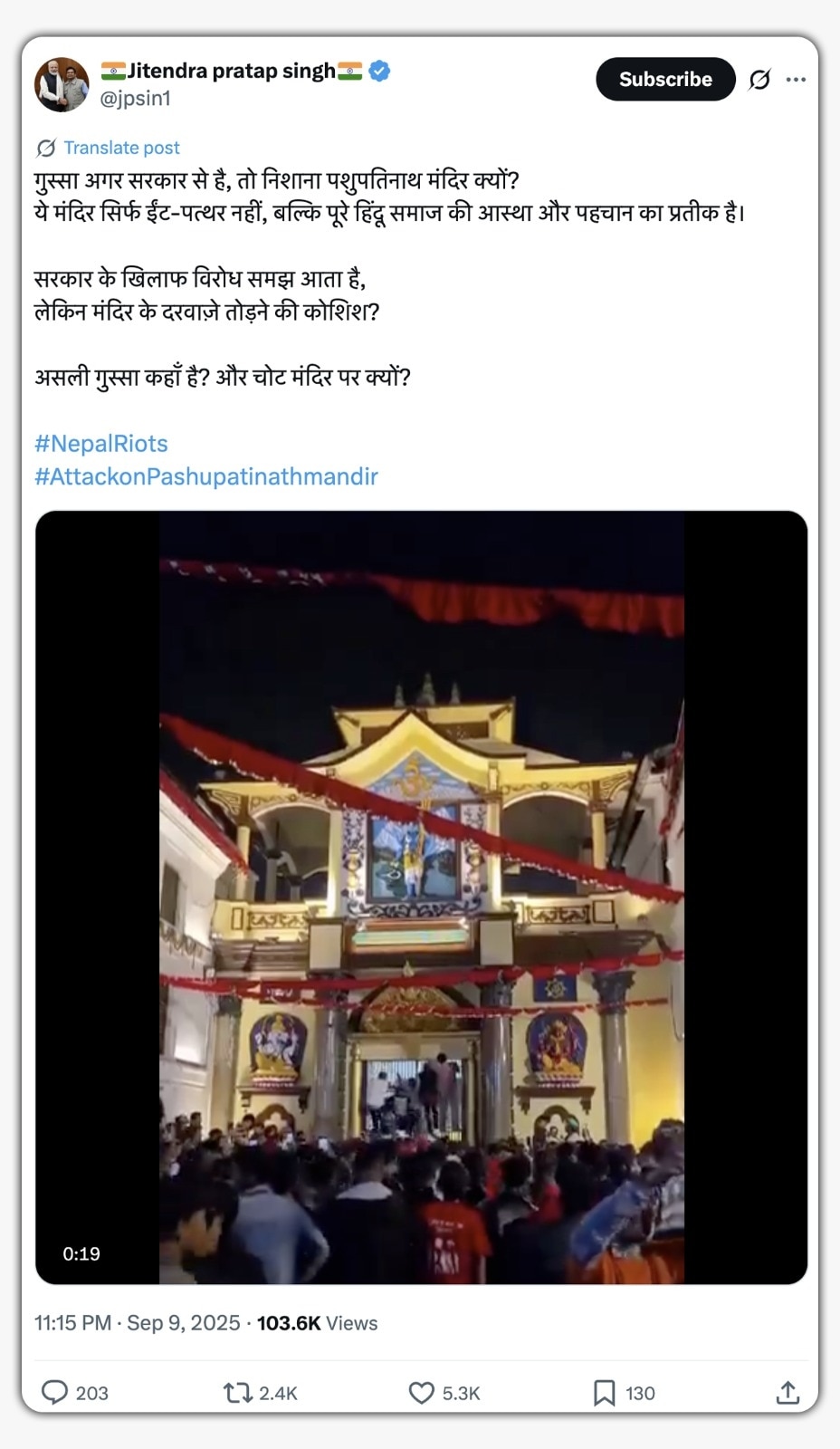 वीडियो को शेयर करते हुए एक एक्स यूजर ने लिखा, “गुस्सा अगर सरकार से है, तो निशाना पशुपतिनाथ मंदिर क्यों? ये मंदिर सिर्फ ईंट-पत्थर नहीं, बल्कि पूरे हिंदू समाज की आस्था और पहचान का प्रतीक है. सरकार के खिलाफ विरोध समझ आता है, लेकिन मंदिर के दरवाज़े तोड़ने की कोशिश? असली गुस्सा कहाँ है? और चोट मंदिर पर क्यों?”