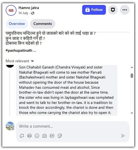 फेसबुक पोस्ट के जवाब में कई लोगों ने इस वीडियो को नक्साल भगवती यात्रा से संबंधित बताया और कहा कि इस यात्रा में शामिल कुछ लोग पशुपतिनाथ मंदिर के बंद दरवाजे पर चढ़कर उसे जबरन खोलकर प्रवेश करने की कोशिश करते हैं, जो कि एक परंपरा है.