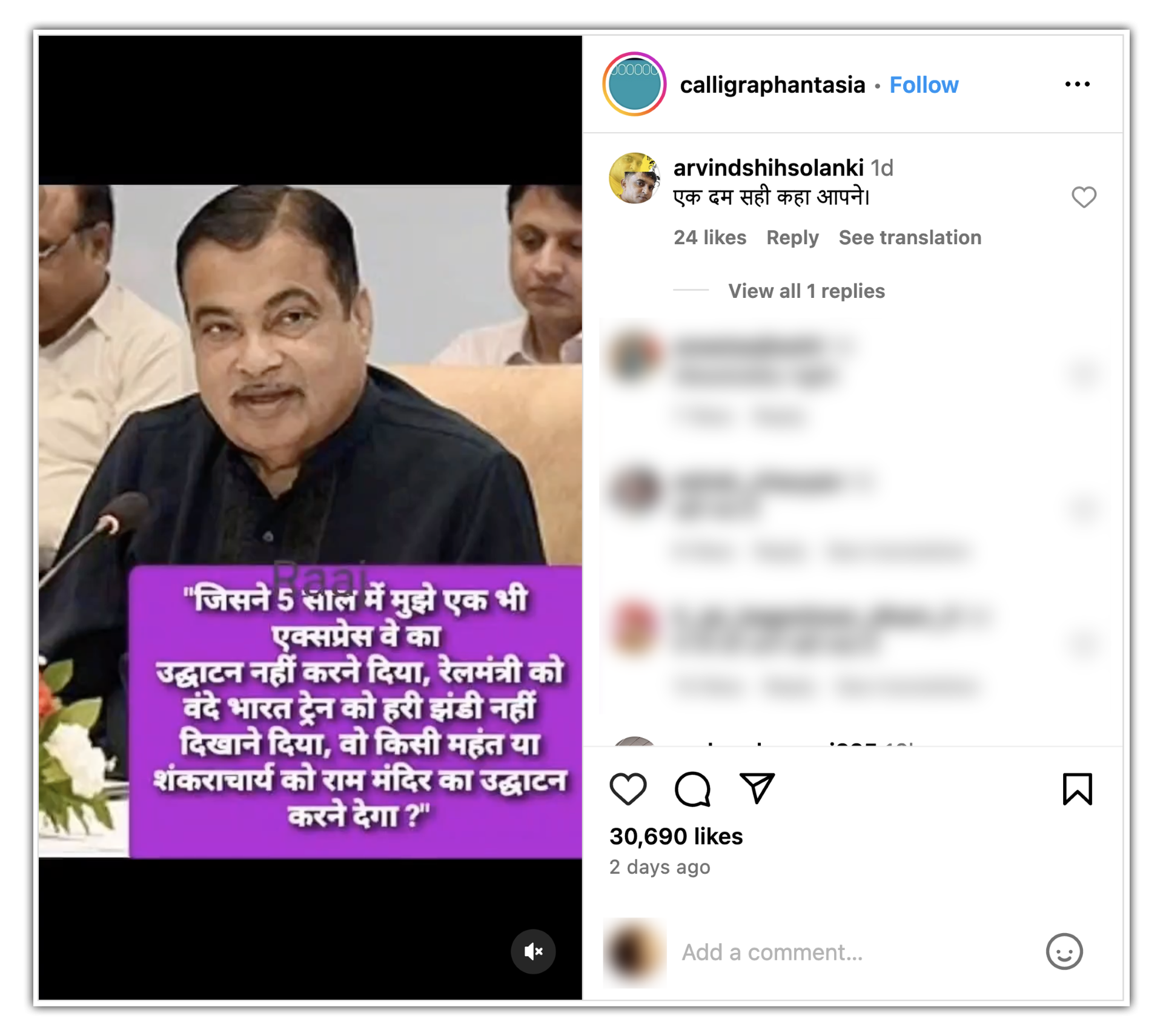 इन सबके बीच सोशल मीडिया पर केंद्रीय मंत्री नितिन गडकरी के हवाले से एक विवादास्पद बयान वाला पोस्टकार्ड वायरल हो रहा है. इसमें गडकरी की तस्वीर के साथ लिखा है, "जिसने 5 साल में मुझे एक भी एक्सप्रेस वे का उद्घाटन नहीं करने दिया, रेलमंत्री को वंदे भारत ट्रेन को हरी झंडी नहीं दिखाने दिया, वो किसी महंत या शंकराचार्य को राम मंदिर का उद्घाटन करने देगा?"