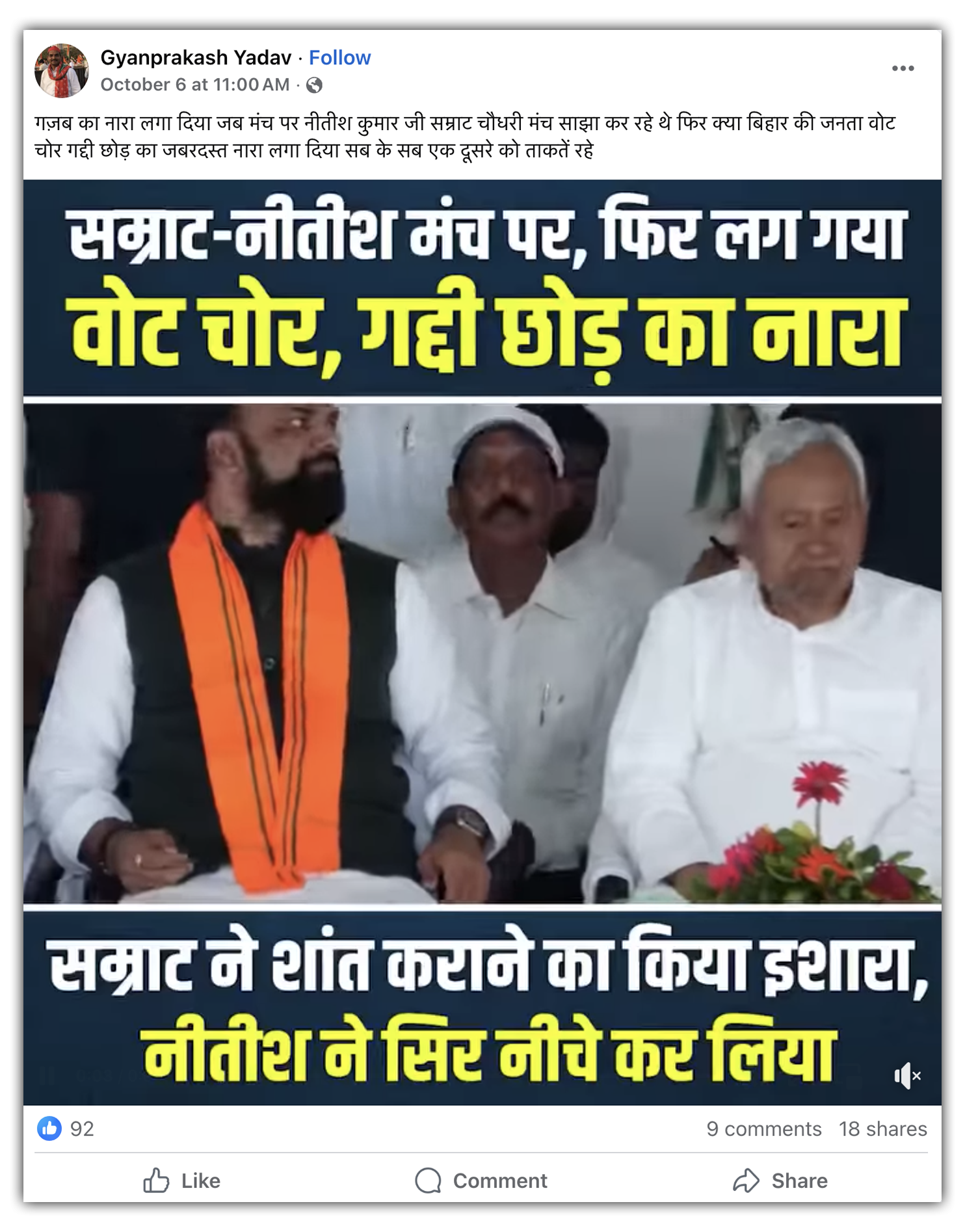एक फेसबुक यूजर ने इसे पोस्ट करते हुए लिखा, "गज़ब का नारा लगा दिया जब मंच पर नीतीश कुमार जी सम्राट चौधरी मंच साझा कर रहे थे फिर क्या बिहार की जनता वोट चोर गद्दी छोड़ का जबरदस्त नारा लगा दिया सब के सब एक दूसरे को ताकतें रहे."