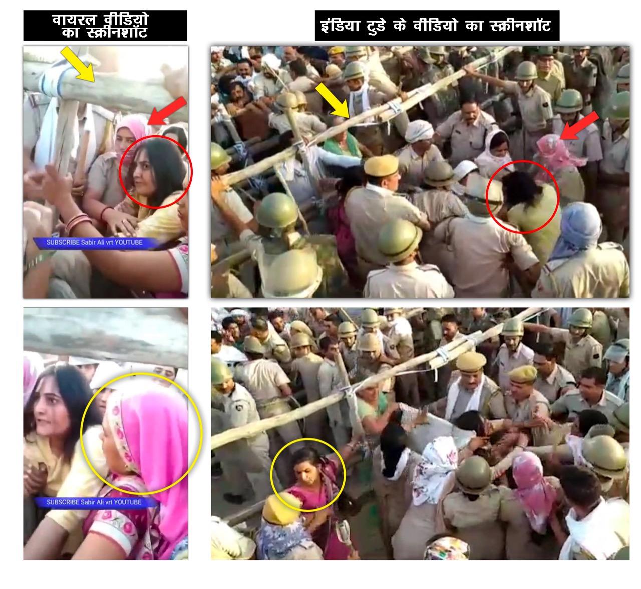 टॉप एंगल से बनाए गए इस वीडियो और वायरल वीडियो के बीच हमें कई समानताएं दिखीं. जैसे, भूमि का हाथ पकड़ने वाली महिला के सर पर ओढ़ा हुआ गुलाबी रंग का कपड़ा, उनके पास लगा बैरिकेड, आदि.