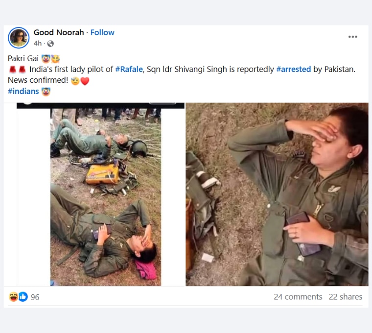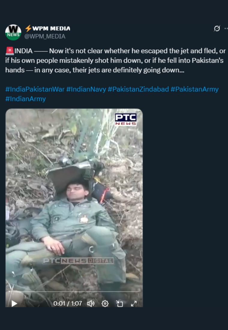 इसी कड़ी में एक और दावा किया गया कि पाकिस्तान के हमले में भारतीय वायुसेना का जेट क्रैश हो गया और एक पायलट घायल हो गया. जो वीडियो शेयर किया गया उसमें वायुसेना का एक पायलट जमीन पर लेटा दिख रहा है.