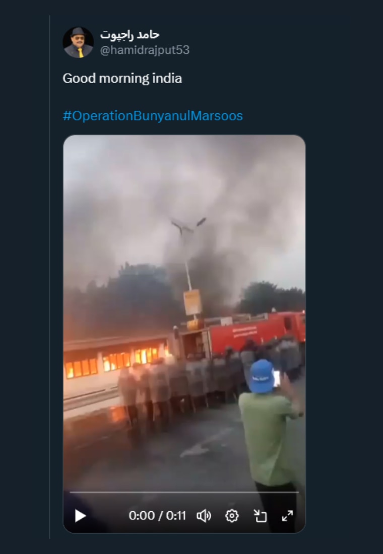 एक वीडियो वायरल हुआ जिसमें किसी इमारत में आग की लपटें दिख रही हैं. इसे ये कहकर शेयर किया गया कि अपने ऑपरेशन 'बुनयान उल मरसूस' के तहत पाकिस्तान ने भारत पर हमला किया जिसमें ये आग लगी.