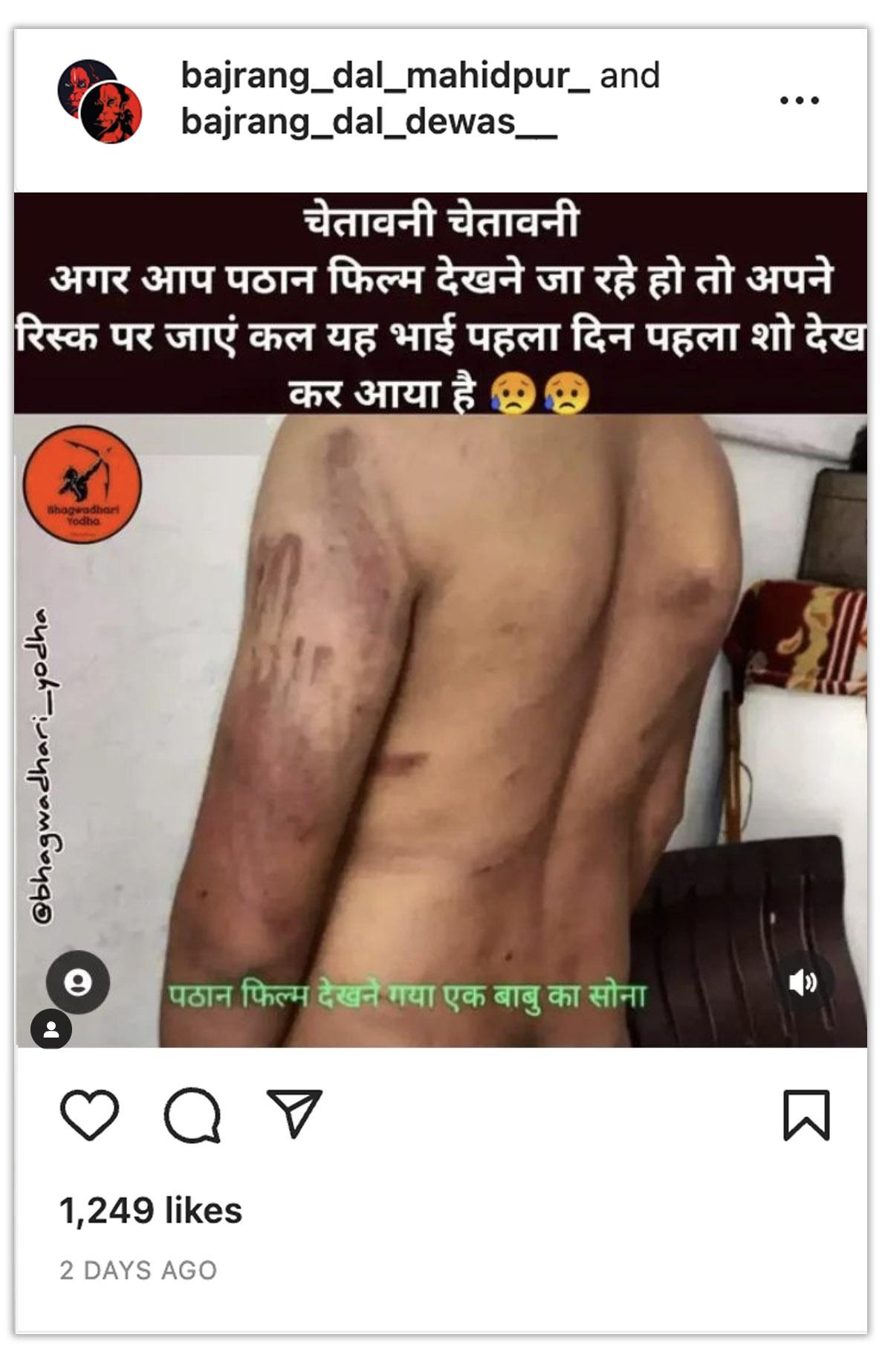 एक इंस्टाग्राम यूजर ने इस तस्वीर को पोस्ट करते हुए लिखा, "पठान फिल्म अपनी रिस्क पर देखे. जय हिंदु एकता"