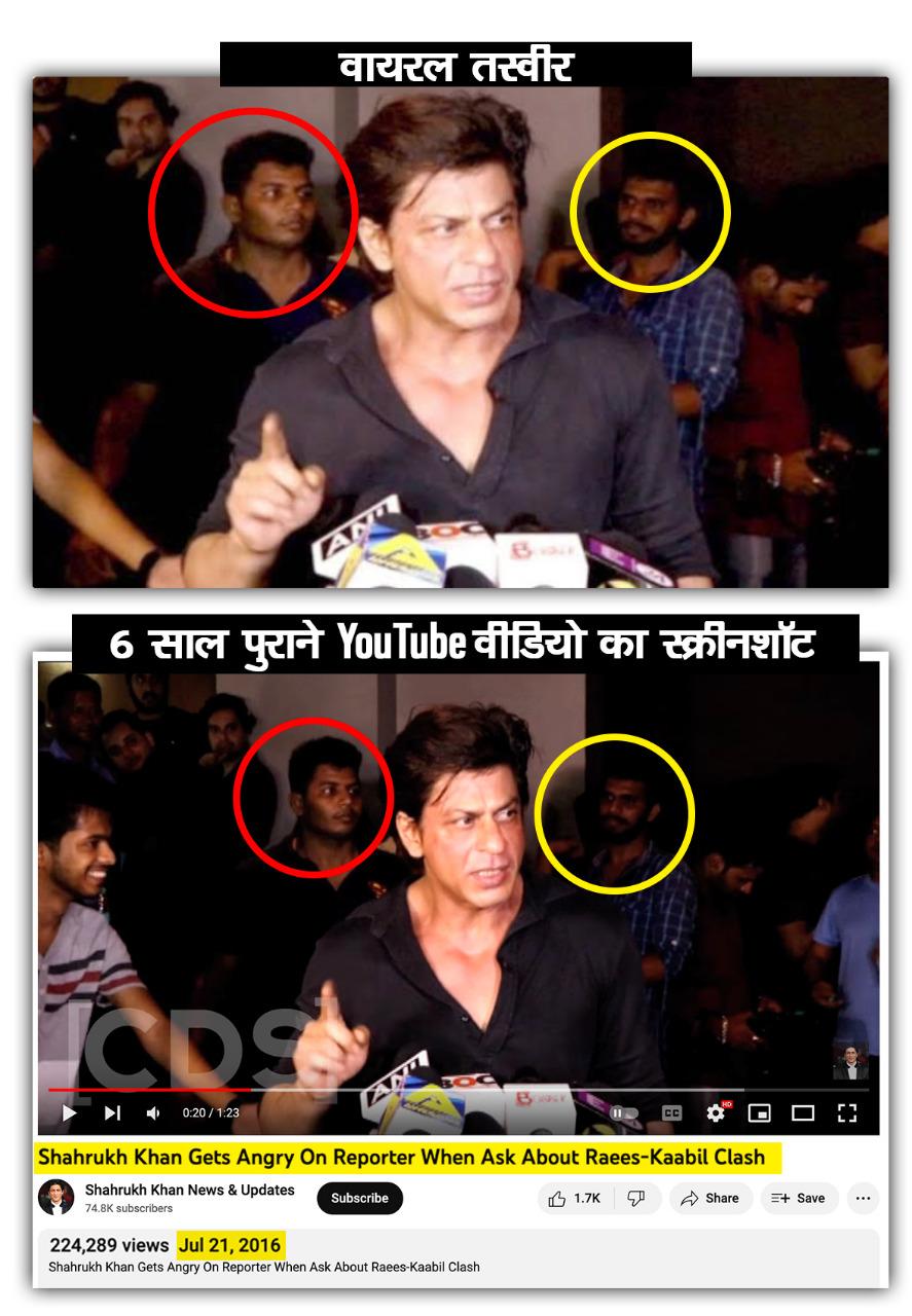 हमने इस वायरल पोस्ट के साथ शेयर हुई तस्वीर को रिवर्स सर्च किया. ऐसा करने पर हमें एक यूट्यूब वीडियो मिला. ये वीडियो साल 2016 का है. इसके साथ लिखा गया है कि रईस-काबिल क्लैश को लेकर सवाल किए जाने पर शाहरुख खान रिपोर्टर से नाराज हो गए. इसमें शाहरुख की कमीज वायरल तस्वीर से मेल खा रही है. साथ ही वो मीडिया से बात करते नजर आ रहे हैं.